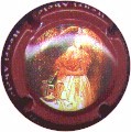 fond marron, double cercle blanc, inscription blanche "Champagne Vincent d'Astrée à Pierry Marne", double cercle pointillé blanc, motif central blanc représentant un moine levant une coupe |