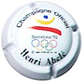 fond blanc, inscription noire "Champagne Official - Henri Abelé", logo des Jeux Olympiques de Barcelone de 1992, inscription noire "copyright 1988 code 92.SA TM", lettre majuscule rouge à l'intérieur "E" |