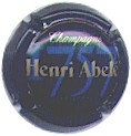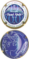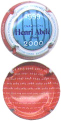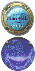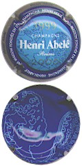 fond bleu, contour or contenant 4 fois l'inscription bleue foncé "Henri Abelé", cercle bleu foncé contenant 2 fois l'inscription blanche Champagne - Henri Abelé - Reims - maison fondée en 1757", fond central bleu avec motif bleu foncé (indéfinissable), 2 dates or en haut "1999" et en bas "2000", inscription centrale blanche "Champagne Henri Abelé - Reims", le verso de la capsule reprend le motif central mais couleurs inversées fond bleu foncé motif bleu clair - échange contre 4 |