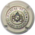fond crème, cercle noir, cercle crème entouré liseré or et noir contenant l'inscription noire "Pascal Adnet - Villers-Marmery", blason central or et noir contenant les lettres "PA", entouré de 2 lions et surmonté d'une couronne |