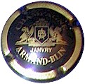 Contour strié noir et or, inscription or "Champagne Armand-Blin, Janvry", entourant un blason or avec les initiales "A" et "B" enlacées, blason entouré par 2 lions ailés et supportant des remparts |