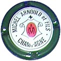 inscription verte " Michel Arnould & Fils - champagne", blason rouge avec les initiales M et A enlacées, fond blanc entouré d'un filet vert, et contour vert foncé |
