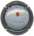 contour vert foncé, fond blanc verdâtre, inscription or "Champagne Verzenay", blason en haut avec un écusson rouge contenant les lettres noires "PA", entouré de 2 enluminures or, signature centrale or "Pierre Arnould" |