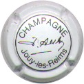 fond blanc, cercle noir, inscription noire "Champagne - Jouy-les-Reims", signature centrale "J. Aubry" |