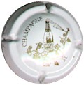 fond blanc, inscription or "Champagne", dessin or représentant une branche de vigne avec feuilles et bouteille de champagne, la mousse se déversant dans une flûte |