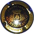 fond or, cercle noir, inscription "Champagne Avizé", double cercle noir, blason central or et blanc contenant un cep de vigneor sur fond blanc |