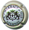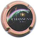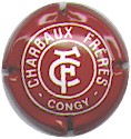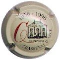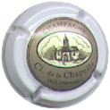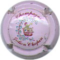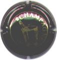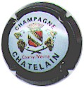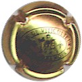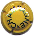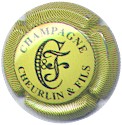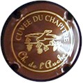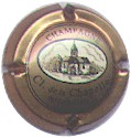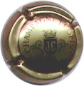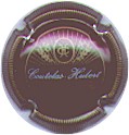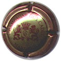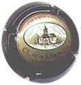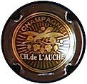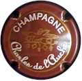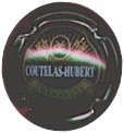 fond marron, double cercle or irégulier, cartouche fond or contenant inscription marron "Champagne", inscription centrale blanche lettres manuscrites "Coutelas-Hubert", écusson ovale or sur fond marron contenant les initiales enlacées "C" et "H", entouré de feuilles et soleil en second plan |