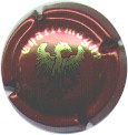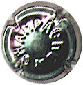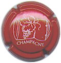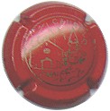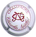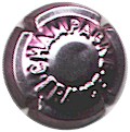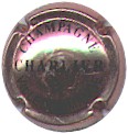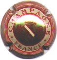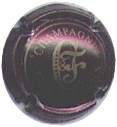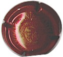 fond bordeaux, inscription or sur le contour ""Champagne Charles Collin - Fontette", cercle or, immense initiale manuscrite mauve "C", portrait bordeaux sur or dans un cartouche triangulaire pointe vers le bas |