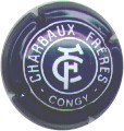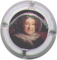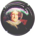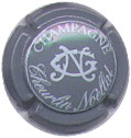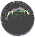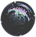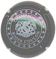 fond noir, inscription or sur le contour "Champagne Charles Collin - Fontette", cercle or, immense initiale manuscrite mauve "C", portrait noir sur or dans un cartouche triangulaire pointe vers le bas |