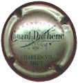 Fond cuivre, inscription noire "Champagne Canard-Duchêne A Ludes F R A N C E - Charles VII Brut" avec "Canard-Duchêne" gras souligné, petit sabre or sur blason noir aigle à 2 têtes surmontés d'une couronne |