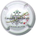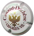 Fond blanc, inscription noire "Champagne Canard-Duchêne A Ludes F R A N C E - Charles VII" avec "Canard-Duchêne" gras souligné, petit sabre or sur blason noir aigle à 2 têtes surmontés d'une couronne |