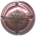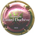 contour or, fond rosé, inscription blanche "Champagne Canard-Duchêne - 1868", blason aigle impérial à 2 têtes surmonté d'une couronne et tenant un sceptre dans une serre, et un globe dans l'autre. |