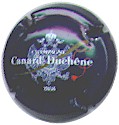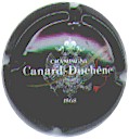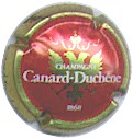 Fond vert foncé, inscription argent "Champagne - A Ludes F R A N C E 1868" avec petit 1868 et "Canard-Duchêne" blanc et gras, petit sabre or sur blason argent aigle à 2 têtes surmontés d'une couronne |
