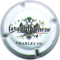 Fond argent, inscription noire "Champagne Canard-Duchêne A Ludes F R A N C E - Charles VII Blanc de Noirs" avec "Canard-Duchêne" gras souligné, petit sabre or sur blason noir aigle à 2 têtes surmontés d'une couronne |
