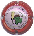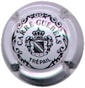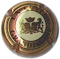 contour or strié bordeaux, fond or, cerclr bordeaux, inscription bordeaux "Champagne Guy Cadel - Mardeuil", blason central bordeaux contenant les initiales enlacées "GC", entouré de 2 lions et surmonté d'une couronne |
