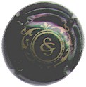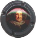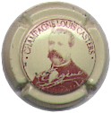 fond crème, cercle marron, inscription marron "Champagne Louis Casters", portrait central marron représentant un buste d'homme moustachu, surchargé par le signature crème "Eugène" |