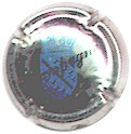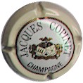 contour crème, cercle or, inscription noire "Jacques Copinet - champagne", blason central conprenant 2 écussons ovales se touchant par le haut, celui de gauche contenant 3 épées or sur fond crème et un ciel noir étoilé, celui de droite contenant 3 lances se croisant sur fond crème et une étoile sur fond noir, une fleur de lys les séparant par le bas, le tout surmonté d'une couronne, entouré de 2 lions et légendé "Pro-Récoltant" |