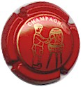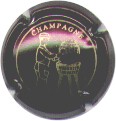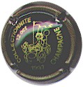 fond or, cartouche ovale contenant un cercle or bordé noir avec inscription noire lettres fines "Club des viticulteurs Champenois", motif central noir représentant 2 vendangeurs transportant un panier de raisin entourés de 2 fleurs de lys |