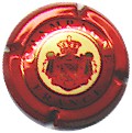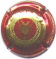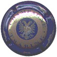 contour or, fond rouge, inscription blanche "Champagne Canard-Duchêne - 1868", blason aigle impérial à 2 têtes surmonté d'une couronne et tenant un sceptre dans une serre, et un globe dans l'autre. |