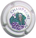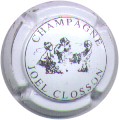 fond blanc, cercle noir, inscription noire "Champagne Joel Closson", motif central noir représentant 3 bacchus jouant au milieu du raisin |