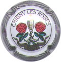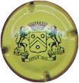 fond or, cartouche ovale contenant un cercle or bordé noir avec inscription "Club des viticulteurs Champenois", motif central noir représentant 2 vendangeurs transportant un panier de raisin entourés de 2 fleurs de lys |