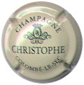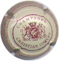 contour crème strié bordeaux, fond crème, cercle applati bordeaux, inscription bordeaux "Champagne Christian Coquet", blason central bordeaux contenant les lettres cursives enlacées "CC", entouré de 2 lions et surmonté d'une couronne |