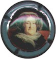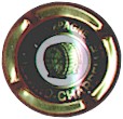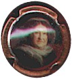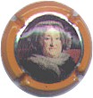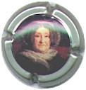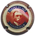 contour crème strié marron, cercle crème, médaillon central rouge pâle représentant un personnage moustachu, un cartouche bleu en haut avec inscription blanche "G. Coquillard", et un cartouche bleu en bas avec inscription blanche "Fondateur" |