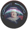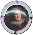 contour or, médaillon central rouge pâle représentant un personnage moustachu, un cartouche bleu en haut avec inscription blanche "G. Coquillard", et un cartouche bleu en bas avec inscription blanche "Fondateur" |