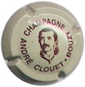fond crème, inscription bordeaux "Champagne André Clouet - Bouzy", portrait bordeaux central d'un homme |