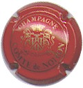 fond rouge, cercle or, inscription or "Champagne - Comte de Noiron", blason central or contenant alternance de barres or et rouges, traversées par un chevron rouge, entouré de 2 lions, surmonté d'une couronne et sous-légendé |