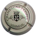 fond crème, cercle noir, inscription noire "Champagne J. Copin - Verneuil", blason central noir contenant les initiales "JC" crème sur fond noir, entouré de fioriture et surmonté d'une couronne |