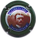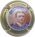 contour vert, médaillon central rouge pâle représentant un personnage moustachu, un cartouche bleu en haut avec inscription blanche "G. Coquillard", et un cartouche bleu en bas avec inscription blanche "Fondateur" |