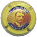 fond jaune, médaillon central rouge pâle représentant un personnage moustachu, un cartouche bleu en haut avec inscription jaune "G. Coquillard", et un cartouche bleu en bas avec inscription jaune "Fondateur" |