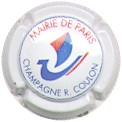 fond blanc, cercle bleu, inscription rouge "Mairie de paris", inscription bleue "Champagne R. Coulon", motif central représentant le logo de la ville de Paris, un bateau aux couleur de la ville bleu et rouge |