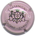 fond rose, inscription noire "Champagne Coutant-Chanoir", blason central noir contenant les initiales "CC" séparées par une barre, entouré de 2 lions, surmonté d'une couronne et souligné par des enluminures |