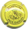 fond jaune, cercle or, inscription or "Champagne Paul Dangin", blason central or tour crénelée, surmonté d'une couronne et entouré de 2 grappes de raisins |