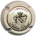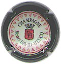 fond crème, cercle or bordé noir, inscription noire "Champagne Ludovic David", blason noir Champagne sur fond de rideau fleurdelysé et surmonté d'une couronne |