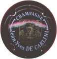 fond marron, inscription blanche grosse écriture "Champagne Jean-Yves de Carlini", motif central marron-jaune dans un cadre carré souligné par une inscription "Verzenay", en haut du cadre les initiales "JDC", en bas la date "1868", au centre, le motif représente un champ de vigne, entouré de branches de vigne avec grappes de raisin et feuille, et en plein centre une serpe |