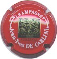 fond rouge, inscription blanche grosse écriture "Champagne Jean-Yves de Carlini", motif central or sur fond noir dans un cadre carré souligné par une inscription or "Verzenay", en haut du cadre les initiales "JDC", en bas la date "1868", au centre, le motif représente un champ de vigne, entouré de branches de vigne avec grappes de raisin et feuille, et en plein centre une serpe |