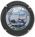 contour noir, cercle blanc entouré noir contenant l'inscription noire "Cuvée de la voile - J.-Y. de Carlini", motif central multicolore représentant un voilier des Assurances "Athéna - GPA" avec logo des 2 filiales sur les voiles |