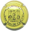fond jaune, inscription blanche grosse écriture "Champagne Jean-Yves de Carlini", motif central noir sur fond jaune dans un cadre carré souligné par une inscription noire "Verzenay", en haut du cadre les initiales "JDC", en bas la date "1868", au centre, le motif représente un champ de vigne, entouré de branches de vigne avec grappes de raisin et feuille, et en plein centre une serpe |