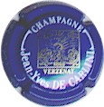 fond bleu, inscription blanche grosse écriture "Champagne Jean-Yves de Carlini", motif central or sur fond noir dans un cadre carré souligné par une inscription or "Verzenay", en haut du cadre les initiales "JDC", en bas la date "1868", au centre, le motif représente un champ de vigne, entouré de branches de vigne avec grappes de raisin et feuille, et en plein centre une serpe |