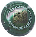 fond vert, inscription blanche grosse écriture "Champagne Jean-Yves de Carlini", motif central or sur fond noir dans un cadre carré souligné par une inscription or "Verzenay", en haut du cadre les initiales "JDC", en bas la date "1868", au centre, le motif représente un champ de vigne, entouré de branches de vigne avec grappes de raisin et feuille, et en plein centre une serpe |
