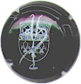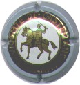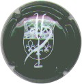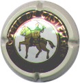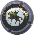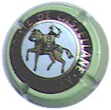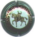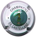 contour vert foncé, cercle fond noir entouré or avec inscription or "Vicomte de Castellane - Epernay", cavalier central or sur fond blanc verdatre tenant un écusson représentant une tour crénelée |