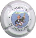 contour rosé, cercle fond noir entouré or avec inscription or "Vicomte de Castellane - Epernay", cavalier central or sur fond blanc bleuté tenant un écusson représentant une tour crénelée |
