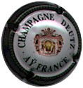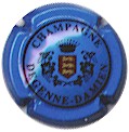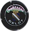 fond blanc, inscriptions bleues "Champagne France", blason bleu de champagne avec "D" et "L" de chaque côté, cercle bleu bordé de points |