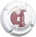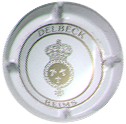 fond crème, cercle noir, inscription noire "Champagne De Meulneer", blason central noir partagé en 4 contenant des léopards, entouré à gauche d'un lion à tête d'oiseau, et à droite par une licorne, surmonté d'un heaume et souligné par un socle |