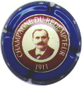 contour bleu avec étoiles blanches, cercle marron bordé crème avec inscription crème "Champagne du Rédempteur - 1911", buste d'homme marron sur fond crème au centre |