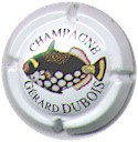 fond blanc, inscription noire "Champagne Gérard Dubois", poisson multicolore au centre |