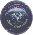 fond bleu foncé, inscription blanche "Champagne - Chigny les Roses - Jean Dumangin", cartouche central ovale blanc contenant les initiales blanches "J" et "D", entouré d'une branche de vigne blanche contenant grappes de raisins et feuilles |